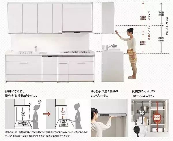 在臺面的高度設(shè)計時,要注意不同區(qū)域的高度要有所差別。如洗菜區(qū)臺面要高一些,切菜、烹飪區(qū)的臺面要低一些。