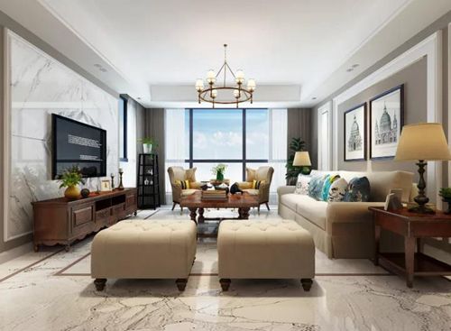 客廳電視背景墻采用白色護墻,搭配美式裝飾畫,選用美式家具,將空間層次搭配的條理有序,顯得大方得體